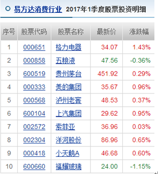 从其持仓来看,根据2017年一季度报告,该基金前十大重仓股包括贵州茅台、格力电器、五粮液、美的集团、泸州老窖、上汽集团等,持有的重仓个股多分布在耐用消费品与服装、食品饮料与烟草、汽车与汽车零部件等细分行业,有效的抓住了今年年初以来的大消费行情,业绩表现突出。