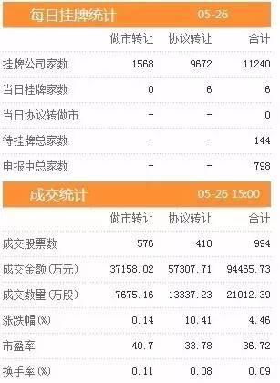昨日新增挂牌企业6家,挂牌企业总数达到11240家,做市转让1568家,协议转让9672家,待挂牌总家数144只,申报中总家数达到798家。