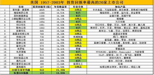 杰里米·西格尔的著作《投资者的未来》整理出 1957-2003 近 50 年间美国股市回报率最高的20只股票,这20家公司不仅成功穿越了多个经济周期未被市场淘汰,并且平均取得了近 950倍的投资回报,大幅超越同期标普500指数,这20家公司中有11家来自消费品行业。