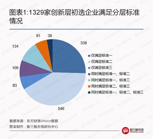 新三板在线研究中心根据东方财富choice数据统计发现,从1329家创新层企业满足的各项标准来看,满足分层标准二的挂牌公司最多,达到774家,占比为58.2%;其次符合标准一条件的有619家,占比46.6%。