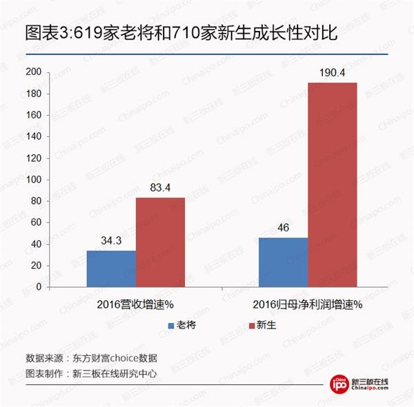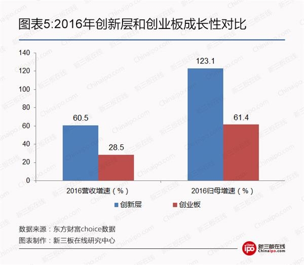 同时,新三板创新层公司2016年净利润的平均增速为123.1%,创业板为61.4%。前者是后者的两倍多。就业绩成长性来看,新三板创新层公司远超创业板。