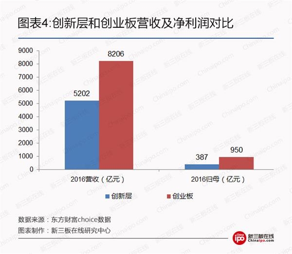 据新三板在线研究中心统计,新三板1329家创新层公司2016年总营收为5202亿元,而创业板企业2016年总营收是8206亿元,后者是前者的1.57倍。同时,整体创新层公司的2016年总净利润却不及创业板的一半,只有387亿元。可见,目前创业板企业的规模比新三板创新层公司大很多。