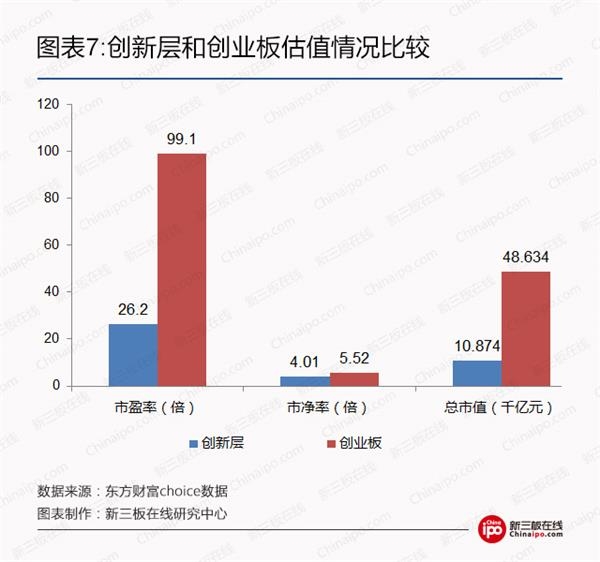 新三板在线研究中心根据东方财富choice数据统计发现,1329家准创新层公司的平均市盈率、平均市净率分别为26.2倍、4.01倍;而创业板公司的平均市盈率、平均市净率分别是99.1倍、5.52倍。