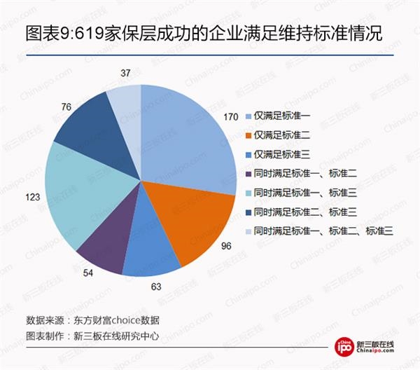 通过对619家成功保层企业进行分析,我们发现,符合标准一的挂牌公司占比最多,占比62%,总数是384家。其次是符合标准二的公司,有264家。