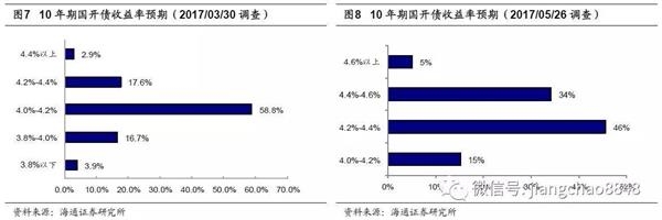 今年3月底10年国债收益率在3.27%左右,当时市场对国债利率上行还是下行还有不少分歧,目前10年期国债收益率已经抬升到在3.66%左右,较上一次调查时上行了接近40BP.