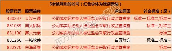 根据股转系统公告,被调出的5家公司中,一铭软件股份有限公司申请自愿放弃进入创新层;常州第六元素材料科技股份有限公司、东海证券股份有限公司、国义招标股份有限公司、上海大汉三通通信股份有限公司因挂牌公司或实际控制人被中国证监会派出机构采取了行政监管措施,根据《分层管理办法》的规定,将其调整出创新层。
