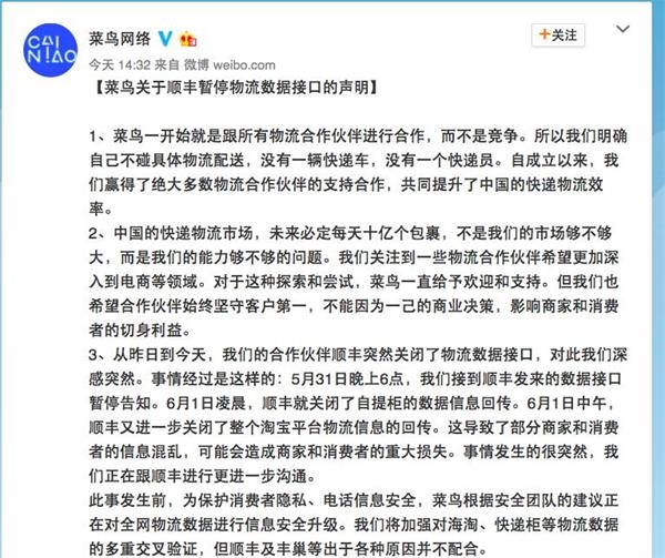 今年14:30左右,菜鸟网络在起官方微博上发表声明,对此感到很突然,正在与顺丰紧急沟通。