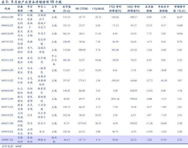 ■板块角度:5月全部A股产业资本延续净增持18.72亿元,主板净增持进一步扩大。2016年12月至今产业资本增持状况不断改善,并在今年4月由净减持转为净增持,5月份继续保持净增持。截至2017年5月31日,5月产业资本净增持18.72亿元,较上月环比下滑16.33%;增减持次数达1394次,环比四月大幅上升133%,其中增持次数明显增多,达919次。中小创持续减持,产业资本更加偏好主板。5月主板扩大净增持,5月主板净增持66.44亿元,较上月环比增长163.13%;中小板持续净减持,中小板净增持-17.04亿元,较上月环比下滑977.70%;5月创业板持续净减持,创业板净增持-30.68亿元,较上月环比下滑2272.56%。主板产业资本增持明显高于中小创。其中,主板连续5个月净增持并且增持规模不断扩大; 2017年以来中小创净减持规模收缩,4月份规模缩至低位,5月份有所抬头。结合5月各板块市场表现,说明相较于中小创,目前产业资本更加偏好主板公司。