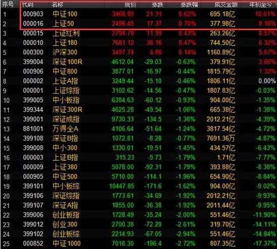 以上证50为例,统计数据显示,今年以来,上证50成分股中,有33只个股股价表现录得正涨幅,占比66%,而16只个股股价则出现下跌,信威集团处于停牌状态。其中涨幅排名前三甲分别为贵州茅台、中国神华、上汽集团,累计涨幅分别为34.45%、34.24%、30.15%。