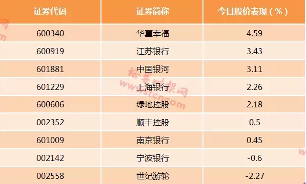 在这利好下,相关个股今日表现极为抢眼。剔除重复个股,9只个股中,7只录得正涨幅,华夏幸福今日上涨4.59%居首,江苏银行、中国银河两者涨幅也超过3%。