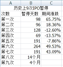 据统计在A股历史上,共有9次暂停IPO后的9次重启(也有称8次暂停、7次重启,主要是2001年7月重启后同年11月又暂停,期间发行新股甚少),市场统计分析,短期效果不错,其中三次下跌,五次大涨。如果暂停发行新股,起码有三分之二的时间,在暂停后我们能够吃饱肚子。