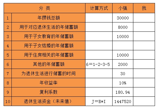 按上表可以看出小强为退休生活攒到的钱也就144万左右,实际需要是188万,还有10万的存款也可以用来当养老金,故:188-144-10=34(万元),还有34万元的资金缺口呢!
