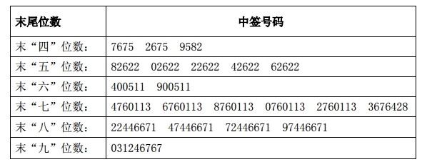 凡参与网上定价发行申购宁波江丰电子材料股份有限公司股票的投资者持有的申购配号尾数与上述号码相同的,则为中签号码。中签号码共有98,442个,每个中签号码只能认购500股宁波江丰电子材料股份有限公司股票。