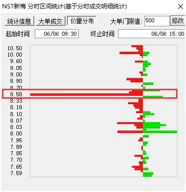 此外,分析NST新梅昨日的价量筹码分布可以发现,该股昨日在8.58元成交最为密集,其全天的成交均价为8.35元,这意味着今天两次临停前追高买入的投资者几乎全被套牢,且很多浮亏巨大。