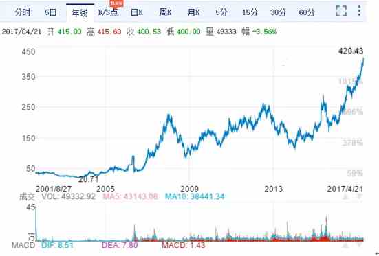 我们看看茅台股份的年线发展图。我觉得作为长期投资茅台的投资者不能仅仅只看日线图或者是月线图,季度图甚至是半年线图。既然长期投资那么我们就拿年线来说话。