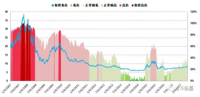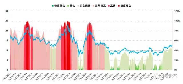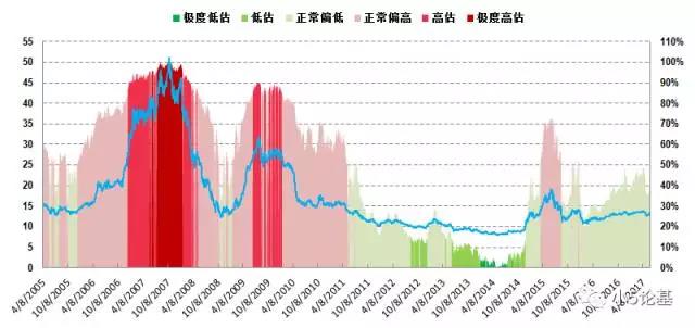 友情提醒一句:左边轴是绝对估值(PE TTM),对应蓝色线;右边轴是估值概率分位,对应那些红红绿绿的。