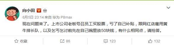 对此,业内人士质疑颇多。知名财经人向小田在微博称,上市公司老板号召员工买股票,亏了自己补贴,跟网红店雇佣黄牛排长队,以及乞丐乞讨前先在自己碗里放50块钱,有什么相同点。