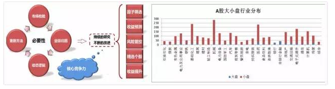 A股市场偏向中小盘,超过85%的股票是市值200亿以下的中小盘,相比较于集中在金融、地产、有色、煤炭、钢铁等少数周期性行业的大盘股,中小盘股票分布行业更广泛,标的范围也更广;同时,从长期来看,A股中小盘股票表现明显跑赢大盘股。这些特点决定了A股中小盘股票适合量化策略投资。