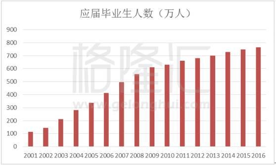 再看参加高考的人数,2000年以来人数逐渐增加,主要也是80后出生人口高峰,但是可以看到随着90后出生人口逐渐下降,在2008年出现下降,近几年也是保持平稳的态势,参加高考人数将面临明显压力,预计将会出现下降。