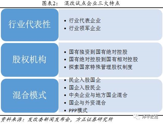 前两批19家试点的企业三大特点:1)从行业代表性看,试点企业都是本行业的代表企业或领军企业,具有典型性能够发挥示范作用;2)从股权结构看,试点企业混改后股权结构都将发生质的变化,有的从国有独资改为国有绝对控股,有的从国有绝对控股改为国有相对控股,有的探索国家特殊管理股权制度;3)从混合模式看,包括民企入股国企、国企入股民企、中央企业与地方国企混合、国企与外资混合、PPP模式等,各有特色。