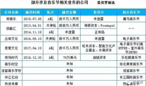 除了摩登天空,还有不少文化公司有主办或承办音乐节的业务,投资界做了不完全统计: