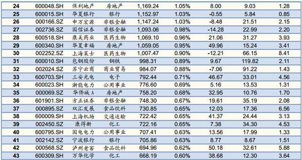 MSCI潜在标的前十大权重股分别是:贵州茅台(5.16%)、浦发银行(3.23%)、上汽集团(3.14%)、兴业银行(3.05%)、长江电力(2.91%)、中国建筑(2.59%)、海康威视(2.44%)、美的集团(2.24%)、五粮液(1.73%)、招商蛇口(1.49%)、国泰君安(1.45%)等。完整169支成分股列表如下。