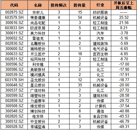 从行业分布来看,这23家上市公司以化工、轻工制造、汽车和机械设备居多。从业绩来看,目前这23家公司有7家公司披露了中期业绩预告,其中仅一家亏损。若从开板后至6月9日期间回落幅度来看,仅3家公司股票录得正收益,分别是荣泰健康、尚品宅配和欧派家居,分别上涨了25.52%、21.56%和8.21%。值得一提的是,前两家公司是机构调研的“常客”。
