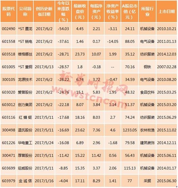 剔除2016年以来上市的次新股之后,时报君统计显示,年内有13只个股创出历史新低,具体名单如下: