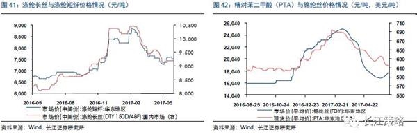 涤纶长丝价格企稳,涤纶短纤价格环比小幅下滑。上周全国涤纶长丝(DTY150D/48F)市场价格达到9200元/吨,环比增速0%,同比增速为13.58%。此外上周华东地区涤纶短纤市场价格为7525元/吨,相较前周的环比增速为-1.05%,较去年同期同比增速为12.31%。