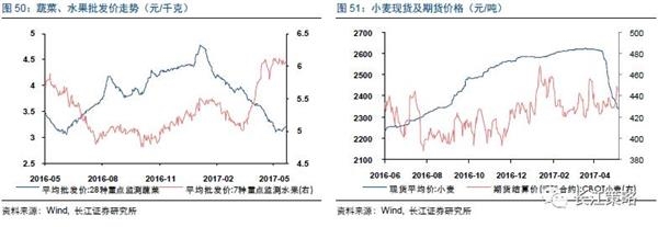 农产品:上周水果价格小幅震荡下滑,蔬菜价格企稳上涨,小麦价格出现下滑,玉米小幅下调,大豆价格企稳,白糖价格震荡向上。近期,小麦主产区自南向北陆续进入收获高峰期,其中湖北、安徽、江苏、河南等省已有部分新麦上市,陈麦市场需求趋弱,优质新麦的供应将缓解市场供需缺口,使小麦价格压力得到释放,短期价格出现回调。长期看来,需求端粮企入市收购积极性高,小麦最低收购价的启动对新麦价格有一定支撑,但由于今年主产区天气较好,新麦产量及质量较高,随着后期大量新麦陆续上市,小麦价格将从高位回落。