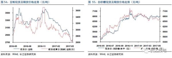 大豆白糖:白糖及大豆价格小幅上涨.由于全球大豆供给处于寡头垄断,17 年拉尼娜现象可能使南美大豆减产,将成为价栺重要推手,预计未来大豆均价将震荡上行。而国内食糖仍处于减产大周期中,预计糖价2017整体仍处于高位。白糖:上周南宁白砂糖现货与期货价格同比增速分别为23.70%和19.43%,环比增速分别为0.74%与1.22%,白糖现货价格达到6780元/吨。本周大豆现货价格收于3651.05元/吨,环比增速为1.72%,同比增速为-0.73%。
