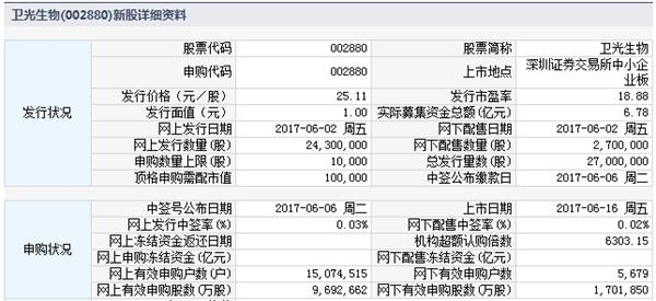 根据交易所公告,深圳市卫光生物制品股份有限公司于2017年6月16日起在深圳证券交易所中小企业板上市交易。