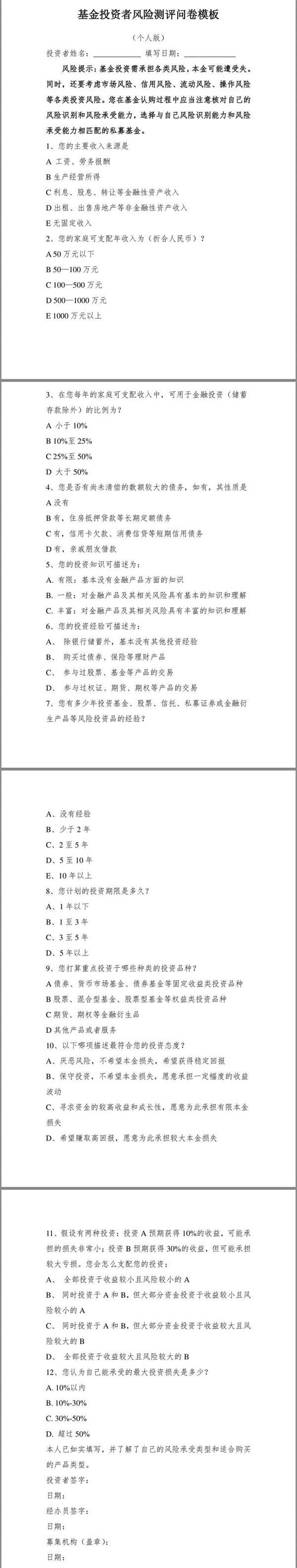 此外,中基协还出台了便于操作的指引文件,包括投资者基本信息表(自然人、机构、产品)、基金投资者风险测评问卷(个人、机构)、基金产品或者服务风险等级名录、投资者类型及风险匹配告知书及投资者确认函、风险不匹配警示函及投资者确认书、投资者转化表(专业转普通、普通转专业)等6个附表。