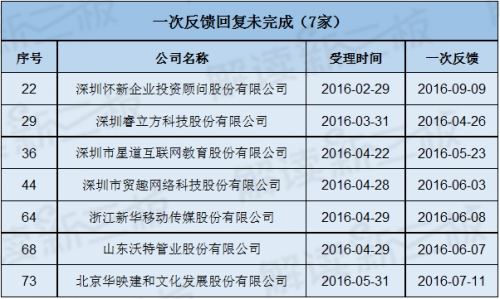 据解读君统计,有7家拟挂牌公司就是上述所说的“重度拖延症患者”,大部分企业申请挂牌两个月内都收到了反馈意见,但却迟迟不回复,从而导致审查中断。