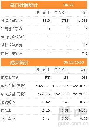昨日新增挂牌企业2家,挂牌企业总数达到11312家,做市转让1549家,协议转让9763家,待挂牌总家数87只,申报中总家数达到743家。