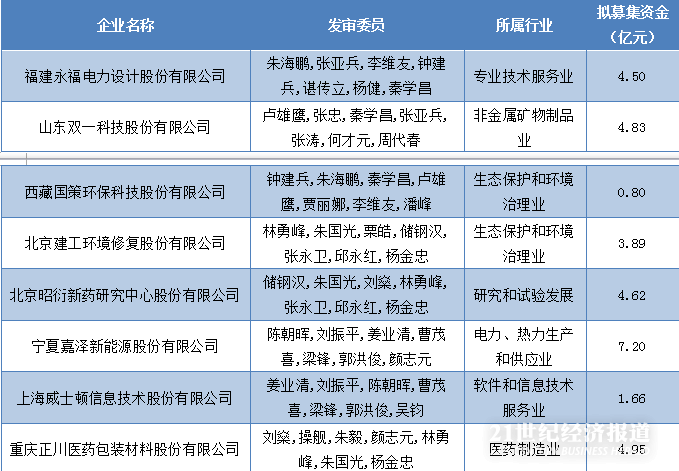 本周发审委将迎来8家首发企业,分别来自七个证监会细分行业,合计拟投入募集资金约32.46亿元。其中拟募资数量最多的企业是宁夏嘉泽新能源股份有限公司,拟投入募资数量为7.2亿元。