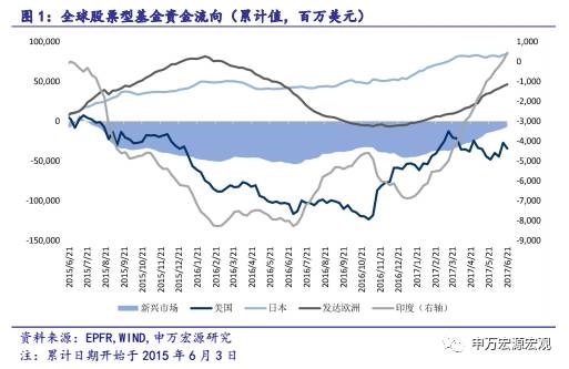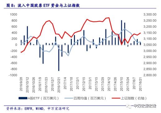 在MSCI宣布结果之前资金呈现大幅流入状态。根据EPFR的数据,从3月23日A股申请加入MSCI指数开始,中国股市基本一直呈现资金流入状态,到6月21日,中国股市资金总共流入44.05亿美元。2017年上半年中国股票市场一共净流入50.49亿美元净资产,新兴市场资金净流入388.10亿美元,香港股市资金净流入12.75亿美元。