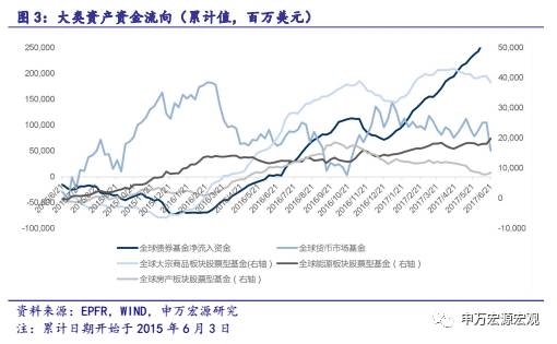 6月21日当周,全球债券型基金、全球能源板块股票基金和全球房地产板块股票基金资金净流入50.03亿、9.12亿美元和6.46亿美元;货币市场基金、大宗商品基金资金净流出227.10亿和11.70亿美元。市场避险情绪减少,风险投资增加。