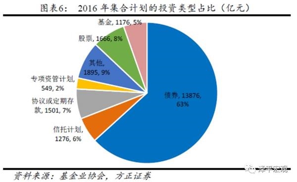 集合计划主要投向债券、股票、协议或定期存款、信托计划、基金,分别占总投资规模的 63.2%、7.6%、6.8%、5.8%和 5.4%。2016年债券市场持续向好,债券供给加大,集合计划优先配置债券类资产,占比较2015年底提升 25.7%。受下半年利率上升、融资类项目兑付风险事件多发等因素影响,基金、协议存款、信托计划占比较 2015年分别下降15.3%、2.4%、1.5%。
