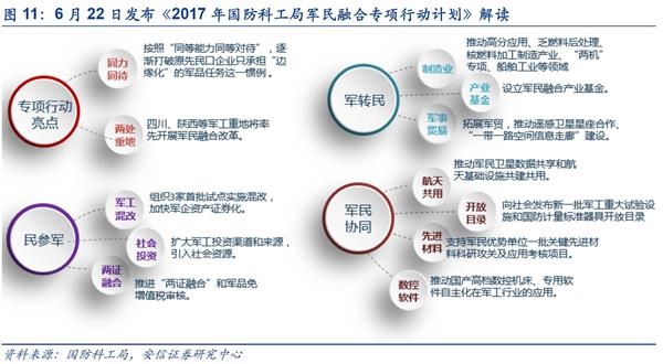 ■军民融合进入战略加速期:主席于2017年6月20日召开军民融合发展委员会第一次全体会议,会议指出要强化使命担当,敢于涉险滩、动奶酪,敢于破难题、闯难关,敢于趟路子、辟新径。两天后,国防科工局发布《2017年国防科工局军民融合专项行动计划》。一切信号都显示着下一阶段,军民融合将加速推进,相关政策进一步细化,成果不断揭晓。