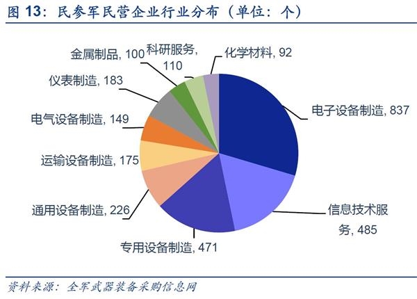 民企在航空,电子,信息化参与度高:全军武器装备采购信息网2015年上线,民企获得军方订单,军地沟通更顺畅,军民协调更透明。目前,我国民营资本在航空,电子和信息化上已经达到了较高的技术水平,其完全有能力承接国防信息化的产品制造和科研任务。根据我们对军民融合动态的监测,国防信息化也是军工需求最大和民企参与最多的领域。在国家军民融合公共服务平台发布的181项军民融合的需求中,航空,电子和信息化方面的需求分别为54,48和44项,合计占到总需求项目的70%。而根据我们对民参军企业行业分布的统计也显示,计算机、通信、电子设备制造和信息化服务企业也占比超过一半。