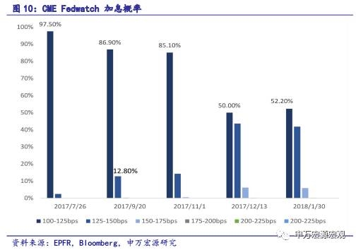 本周6月议息会议前,通胀和零售数据公布后,数据不佳,影响市场情绪。但美联储表示经济活动继续温和扩张,劳动力市场温和且稳健,家庭收入、支出有所复苏,于是提高利率至1%-1.25%。6月份议息会议后的经济预测以及利率点阵图来看,对比3月份的会议情况,利率点阵图显示利率2017年加息路径不变,美联储对经济前景整体乐观。预计2017年加息三次,年内还有一次加息。节奏不会太快,下次预计会在12月,风险面需要继续观察特朗普财政与通胀预期是否会超预期抬升。