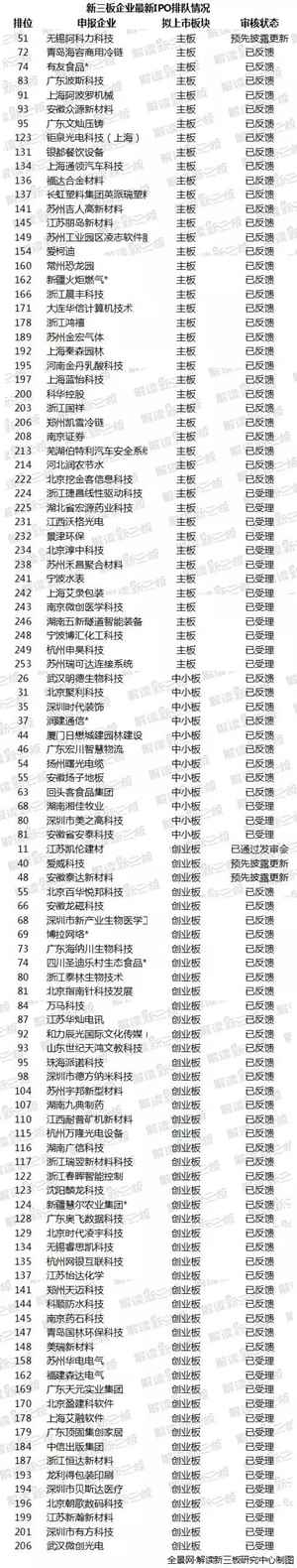 IPO审核状态方面,在这转板的107家企业中,已通过发审会的有1家(凯伦建材),预先披露更新3家(爱威科技、无锡阿科力科技、安徽泰达新材料),已反馈73家,已受理30家。