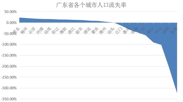 如图所示,茂名市的人口流失率为22.62%,梅州市为20.18%,本地人口大量外流。可是,同处一省的深圳市和东莞市的人口流入率却高达207.83%和323.27%,外地人口大量涌入。