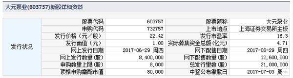 根据交易所公告,广东凌霄泵业股份有限公司于2017年6月29日进行网上申购。本次公开发行股票总数量1,937万股。网上发行1,937万股,占本次发行总量的100%。本次发行股份全部为新股,不安排老股转让。