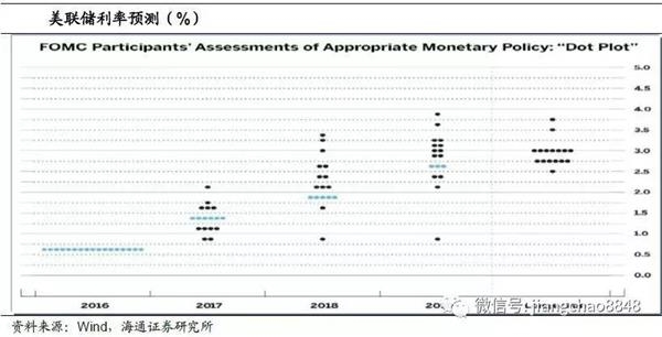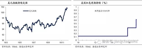 联储加息预期强化。按照美联储的预测,到2017年末的联邦基金利率均值约为1.4%,意味着2017年还有3次左右的加息,而此前市场预期美联储17年加息两次,因而市场普遍把去年12月的美联储加息视为鹰派加息。