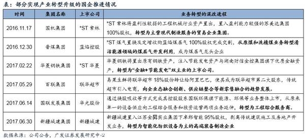 从地方国企来看,实现主营业务转型升级的模式更为多样化,比如蓝焰控股、*ST华菱等通过置出原有盈利能力较差的业务、置入集团旗下优质资产,实现向新兴产业转型;联华超市、华光股份等则通过引入战投、换股吸收方式延伸产业链布局,加大产业链利润率较高的业务布局最终改善公司业绩。