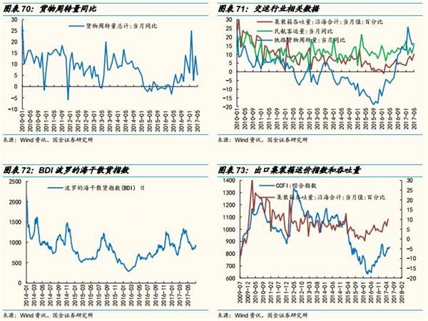 上游:上游大宗商品最近一个月反弹幅度较大,黑色商品表现最强,有色表现次之,表现最弱的原油上周也开始大幅上涨。除了原油外大部分商品库存均先后有所下降,钢铁社会库存从3月开始下降,目前维持低位,有色中锌和铜上交所库存下降较快,煤炭库存自6月开始下滑,这早于之前正常的季节规律。