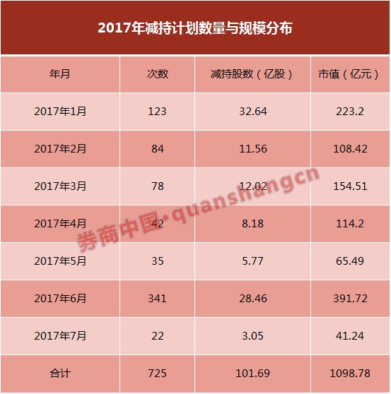 通过表格我们也可以看到,今年以来出现了两个减持计划发布高峰,一次出现在1月份,该月共发布了123项计划,一次就是出现在了今年6月份,该月共发了341份减持计划。