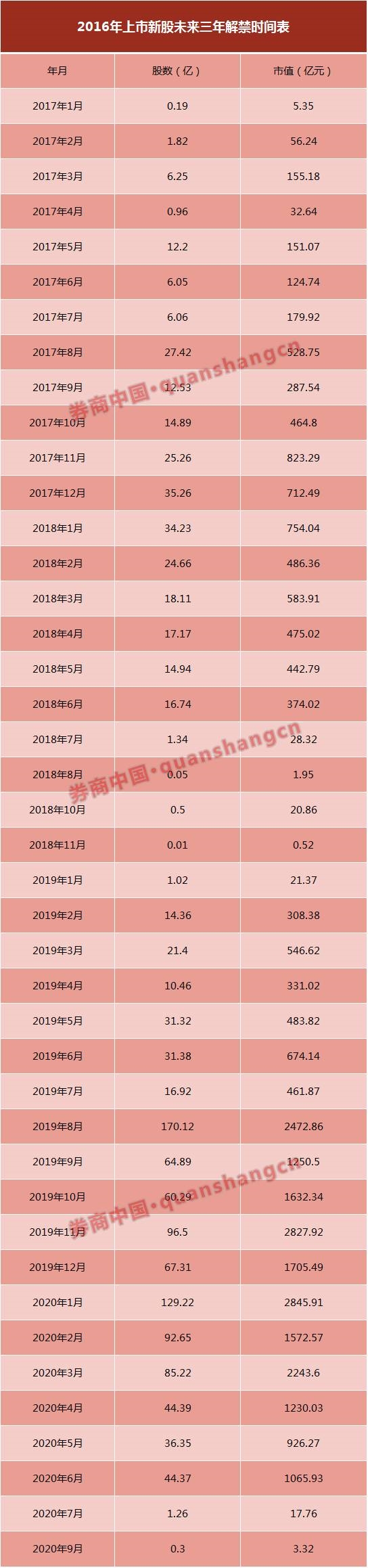 据券商中国记者统计,A股2016年以来共计上市了476只新股,剔除已经解禁部分,预计到2020年的这三年期间,还将陆续解禁1268.88亿股,涉及市值达到2.88万亿元。